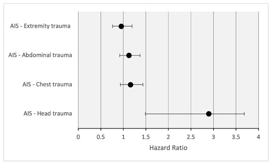 The univariate Cox regression analysis revealed a highly significant impact of head injury severity on mortality, with each additional AIS score point in the head region increasing the risk of death by 2.9 times (HR = 2.894 [1.489–3.687], p < 0.001), as shown in Figure 4. In contrast, injuries in other body regions did not exhibit a significant influence on mortality, although there was a trend towards an increased risk with severe injuries in the thoracic and abdominal regions (thorax: HR = 1.159 [0.935–1.434], p = 0.128; abdomen: HR = 1.123 [0.920–1.370], p = 0.254).