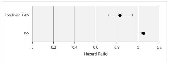 In the context of the multiple Cox regression analysis, the influence of the ISS (Injury Severity Score) and prehospital GCS (Glasgow Coma Scale) was confirmed. An increase in the ISS was significantly associated with an elevated risk of mortality (HR = 1.053 [1.031–1.075], p < 0.001), as shown in Figure 5. Similarly, a lower GCS score was significantly linked to an increased likelihood of mortality (HR = 0.828 [0.723–0.948], p = 0.006).