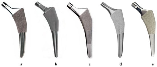 Commercialized femoral stems from five different manufacturers, which were included in the analysis. (a) Depuy Tri-lock®, (b) Biomet Taperloc®, (c) Smith & Nephew Anthology®, (d) Stryker Accolade II®, (e) Corentec Fit®.