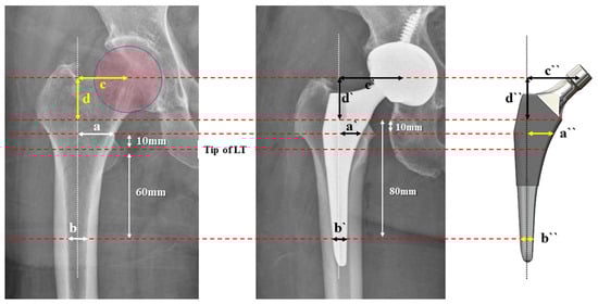 Reference points of measurement in this study. For radiographic evaluation, proximal–medial ML width was measured at 10 mm proximal to the tip of the LT (a) and distal ML width was measured at 60 mm distal (b). For implant parameters, a 10 mm distal level to the medial proximal starting point of the porous coating was used to measure proximal–medial ML width (a`) and an 80 mm distal level for distal ML width (b`). The medial offset (c,c`) and vertical offset (d,d`) were also measured for the offset analysis. Corresponding parameters are also shown on the schematic illustration of a femoral implant on the right (a``–d``).