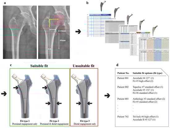 A flow diagram outlining the fit analysis process was implemented. (a) Anatomical parameters extracted from the radiographs of each patient were encoded with R for matching trials encompassing (b) all available sizes from the five femoral stem products. (c) Fit types 1 and 2 were deemed suitable, while type 3 or unmatched samples were categorized as unsuitable. (d) Through the consolidation of outputs that integrated specific suitable fit options for each patient, the results were structured for the comparative assessment of the subject femoral stems.