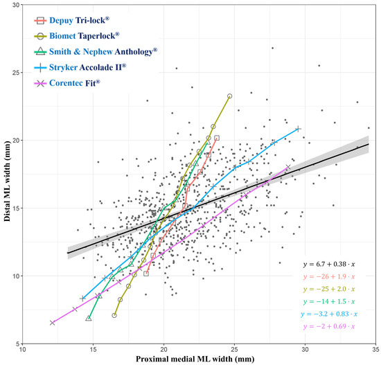 Plots as a result of ML width analysis. The regression line from background dots of individuals in the study population is depicted as a thick black line with a 95% confidence interval as shaded areas. Distal ML widths to proximal–medial ML widths are shown for five femoral stems, with slopes calculated and presented in the lower right corner.