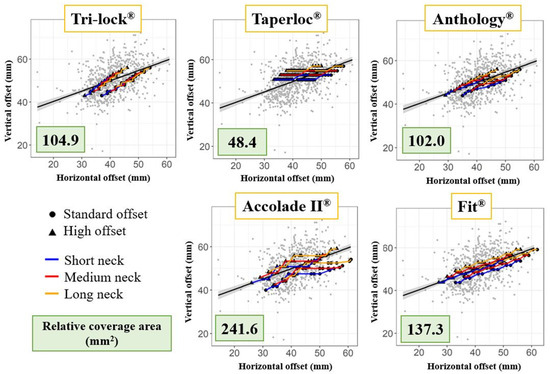 A comparison of the relative coverage area among various offset and neck length options does not directly signify how many femora are compatible to a stem. Instead, it represents a notion of a specific stem’s capability to cope with various anatomical situations. The results suggest that offering high offset options are essential for widening the coverage within the population, but also the gap between offset options must not be too small. High offset options of Accolade II provided not only lateral-to-lateral shift but also variations in vertical offsets by adjusting the caput–collum–diaphyseal (CCD) angles, thus achieving the largest coverage.