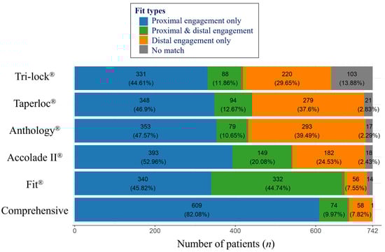 For the fitting analysis by the trial of all available sizes of each stem, utilizing data from the ML width analysis, Fit (90.56%) best provided suitable stems for the patients with significance (p < 0.001, Pearson chi-square), followed by Accolade II (73.04%). Among the suitable results, the proportion of fit type 2 (simultaneous proximal and distal engagement) made a difference between stems. Taperloc (59.57%), Anthology (58.22%), and Tri-lock (56.47%) showed a similar fit for this population. The overall results of the automated fitting trial, regardless of the product type, showed that optimal results were obtained for 92.05% of the population (Figure 6).