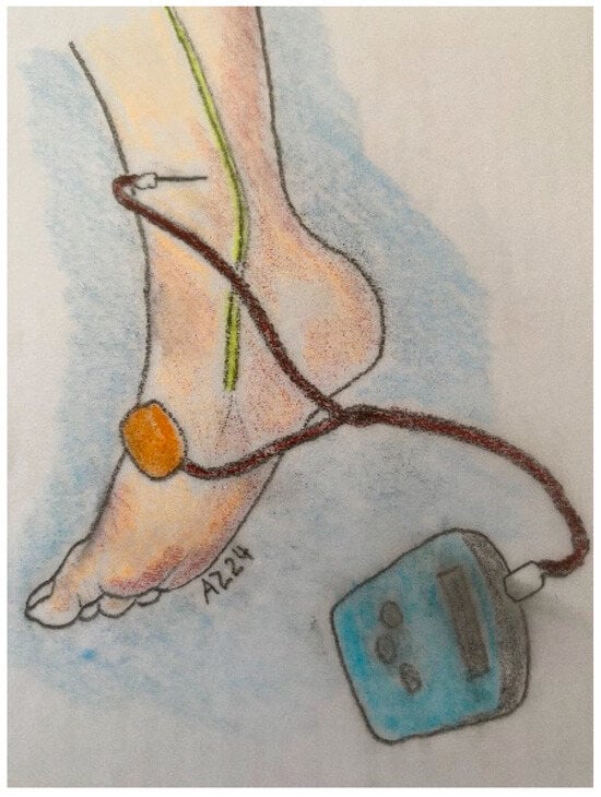 Both the electrode and the needle are connected to a low-voltage (9V) electrical stimulator. The Urgent® PC Stimulator (Laborie Medical Equipment, SN N-11193, Laborie Medical Technologies Corp., Portsmouth, NH, USA) was used for measurements during the neuromodulation sessions. This device is frequently cited in studies on PTNS [15,21,22,23]. The stimulation is applied at a fixed frequency of 20 Hz and a pulse width of 200 ms, with the current gradually increased from 0 to 10 mA until a motor response is observed, such as plantar flexion of the big toe or a ‘fan-shaped’ opening of the toes. This motor response is typically accompanied by a light tingling sensation in the sole of the foot [24]. A monopolar configuration was used for stimulation. The electrical current is a continuous square waveform with a duration of 200 μs and a frequency of 20 Hz. The intensity of the current is determined by the highest level tolerated by the patient [25].
