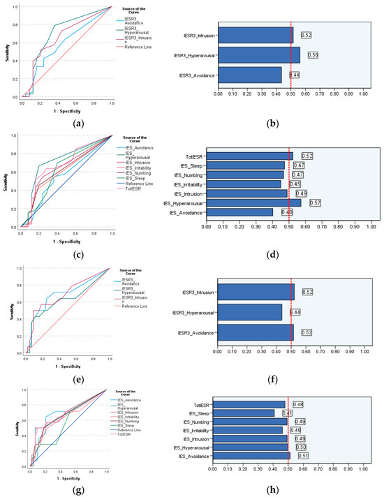 Receiver operating characteristic (ROC) curve represents a reliable computational method, which illustrates the ability of a risk prediction model to distinguish between individuals with and without a condition by determining clinically relevant thresholds. The curve plots the true-positive rate (TPR or sensitivity) against the false-positive rate (FPR or specificity) across all thresholds (typically at selected intervals). Each point on the ROC curve corresponds to a specific sensitivity and specificity pair [32,41]. We ran an ROC curve analysis using the two IES-R structures to predict the PSS-SR, hypertension diagnosis, and high BMI. For this test, the IES-R and its subscales were used as continuous variables. In the meantime, the participants were categorized according to the reported cutoff of the PSS-SR into two categories (23 or below: no PTSD, and above 23: possible PTSD) [40] as well as BMI (below 25: normal weight, and 25 or above: overweight/obesity). This test was intended to examine the cutoff scores of the IES-R and its three/six subscales, which might distinguish those with PTSD, high BMI, and hypertension. The diagnostic accuracy of the ROC model corresponds to the values of the area under curve (AUC), sensitivity and specificity for all possible cut points, and the Youden index—the sum of sensitivity and specificity of the optimal point minus one. In ideal tests, all the values should be close to one [41].