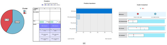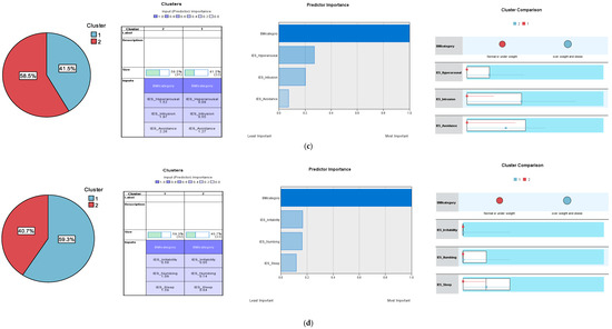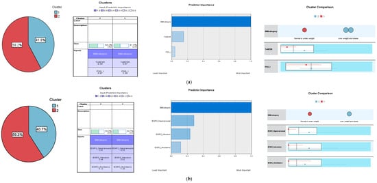 Two-step cluster analyses with five sets of trauma input variables [(IES-R, PSS-SR), (intrusion, hyperarousal, and avoidance dimensions of IES-R3 and IES-R6), (numbing, sleep disturbance, and irritability dimensions of IES-R6), and (avoidance, arousal, and re-experiencing dimensions of the PSS-SR)] converged on revealing the presence of two separate clusters (normal weight/low BMI and overweight/obese) as the most efficient and robust classification of the participants according to their body composition. The values of the silhouette measure of cohesion and separation (around 0.5) indicate that the IES-R, PSS-SR, and their subscales can fairly classify the sample, while AIC values (Supplementary Materials S2: Supplementary Table S4) confirmed the two-cluster classification as the best solution. Model comparisons (Figure 2) show persistently higher levels of all trauma variables (except for the numbing and irritability dimensions of IES-R6) among participants in the overweight/obese cluster than in the normal weight cluster. As shown in Figure 2 (predictor importance charts) and Supplementary Materials S2: (Supplementary Table S5), the highest predictor importance was recorded for the hyperarousal and intrusion subscales of both IES-R structures followed by the irritability and numbing subscales of IES-R6, then the IES-R (range = 15–28%). On the contrary, the PSS-SR and its three subscales witnessed the lowest predictor importance (range = 1–9%).