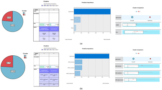 Using the same five sets of trauma input variables to classify the participants according to the diagnosis of hypertension converged on revealing the presence of two separate clusters (normal blood pressure and hypertension) as the most efficient and robust classification only in two tests, which comprised the IES-R and the PSS-SR as well as the intrusion, hyperarousal, and avoidance dimensions of IES-R3 (Figure 3). One cluster solution emerged in the rest of the tests. Silhouette measure indicated humble model fit, and the AIC with the lowest values appeared only in the two-cluster models (Supplementary Materials S2: Supplementary Table S6) while the highest predictor importance was recorded for the intrusion and avoidance subscales followed by the IES-R (Supplementary Materials S2: Supplementary Table S7).