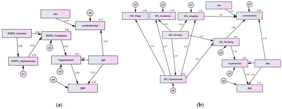 Path analysis model using the three and six dimensions of the Impact of Event Scale-Revised (IES-R: (a) and (b), respectively) to predict hypertension, body mass index (BMI), and current smoking status.