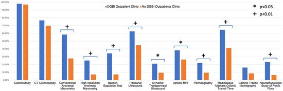 Furthermore, having a DGBI clinic was associated with a more frequent routinely used multidisciplinary approach with other specialists; the most frequent collaborations were with surgeons (45.1%) and radiologists (36.3%). Moreover, specific diagnostic tests to assess constipation were more accessible to GEs having a DGBI outpatient clinic in their structure. ARM (both conventional and high-resolution/high-definition ARM), balloon expulsion test, transanal and transperineal ultrasound, defeco-MRI, perineography, colonic transit time with radiopaque markers and neurophysiologic study (Figure 1) were more frequently carried out in structures with a DGBI clinic.