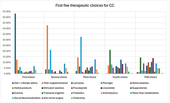 The following supporting information can be downloaded at: https://www.mdpi.com/article/10.3390/jcm13206047/s1, Figure S1: Preferred therapies for chronic constipation among Italian GE. For each therapeutic preference (from 1 to 18), the frequencies of prescribed therapies are reported.