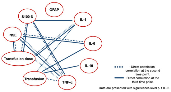Among the markers of cerebral injury, the S-100-β protein showed a moderate correlation with transfusion at both the second (Rho = 0.48; p = 0.00065) and third evaluation points (Rho = 0.36; p = 0.01330). Neuron-specific enolase (NSE) exhibited a similar pattern: Rho = 0.41 (p = 0.00421) after the completion of CPB and Rho = 0.35 (p = 0.01667) 16 h after the surgical intervention. The glial fibrillary acidic protein (GFAP) did not show a statistically significant correlation with the volume of transfusion.