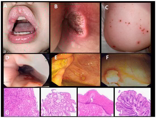 A 4-year-old girl presented at 6 weeks old with recurrent fevers occurring every few days, a scanty papular rash on her face and torso, oral and deep perianal ulceration, severe gastrointestinal mucosal ulceration (Figure 1A–F), and raised C-reactive protein (CRP) (119 mg/L) and faecal calprotectin (600–800 mg/g faeces). Upper and lower endoscopy and biopsies repeatedly showed the extensive mucosal ulceration of the oesophagus, ileocaecal valve, colon, and perianal area (Figure 1G,H). The small bowel (duodenum and ileum) showed only minor inflammation in the lamina propria. A histological analysis of oesophageal samples (ulcer) and colonic mucosa showed a mixed neutrophil, macrophage, and lymphocyte infiltration indicative of inflammation but no granuloma or vasculitis. The oesophageal ulceration was severe enough to involve the underlying muscularis (Figure 1D,G). The child vomited with food, was unable to swallow, and could not be given sufficient nutrition orally. Initially, gastro–jejunal feeds were tolerated but, with time, she was unable to tolerate any enteral feeds and required total parenteral nutrition.