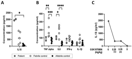 Serum cytokine concentrations in the patient compared to controls. (A) Serum total IL-18, (B) serum TNF-α, IL-6, IFN-γ, and IL-1β concentrations in patient prior to treatment (two samples taken at different times), febrile children (n = 5), and healthy adult controls (n = 5); (C) serum total IL-18 levels in patient prior and after treatment for different days and doses. Kruskal–Wallis and Mann–Whitney U test. * p-value < 0.05; ** p-value < 0.01; *** p-value < 0.005; **** p-value < 0.001; if not indicated, data not significant.