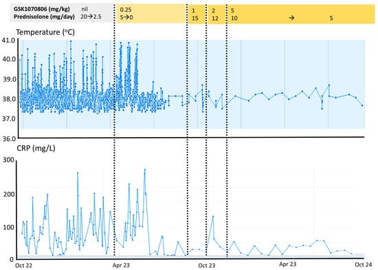 In view of the isolated elevated serum IL-18 and failure of other treatments, targeted therapy with an anti-IL-18 biologic was administered. GSK1070806 is a humanised high-affinity IgG1 monoclonal antibody directed against IL-18. As this biologic has not been previously administered in children, it was commenced fortnightly at a dose of 0.25 mg/kg intravenously, and it was incrementally increased at 3–4 monthly intervals to 5 mg/kg. At a dose of 1 to 5 mg/kg fortnightly, the patient’s fevers, gastrointestinal symptoms, faecal calprotectin (decreased from 600 to 800 mg/g faeces pre-treatment to a nadir of 134 mg/g faeces on 5 mg/kg GSK1070806), and CRP settled, allowing for the discontinuation of total parental nutrition, the resumption of a normal diet, and discharge from hospital (Figure 3 shows the resolution of fevers and improvement in serum CRP). A histochemical analysis of upper and lower endoscopy biopsies on 5 mg/kg of GSK1070806 showed the restoration of the squamous epithelium in the post-oesophagus as well as the restoration of the colonic mucosa, demonstrating that the inflammatory changes—particularly marked in the oesophagus, ileocecum, and colon—had largely been resolved (Figure 1I,J). Oral steroids were reduced to 0.3 mg/kg/day. Total serum IL-18 was undetectable on 5 mg/kg of GSK1070806 (Figure 2C). There were no adverse effects relating to the drug at any stage of treatment.