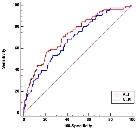 To demonstrate the prognostic role of ALI in our population and the superiority of this index on the simple NLR, we included all the variables that demonstrated differences among the groups in a Cox regression model. However, since ALI includes the NLR in its calculation, we tested the two variables for collinearity. Spearman rho demonstrated a strong inverse correlation between the two variables (−0.95, p < 0.001), subsequently excluding the possibility of including the two variables in the same Cox regression model. Therefore, to identify whether ALI was more associated with the outcome than NLR, we compared the predictive accuracy of the two variables using ROC curves analysis.