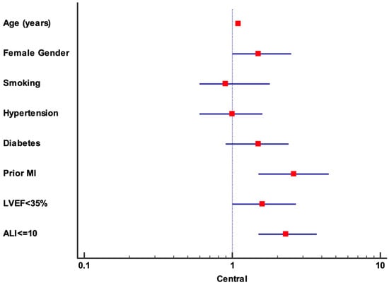 When conducting the multivariate analysis treating LVEF and ALI as discrete variables (with cut-offs at 35% and 10, respectively), LVEF (HR: 1.6, 95% CI: 1–2.7, p = 0.48) loses its statistical significance. Conversely, prior MI (HR: 2.6, 95% CI: 1.5–4.5, p = 0.001) and ALI (HR: 2.3, 95% CI: 1.5–3.7, p < 0.001) remain independent predictors of the outcome, with ALI presenting a higher HR compared to when it is considered a continuous variable. However, the loss of predictive power when using LVEF as a discrete variable suggests that, in our population, LVEF likely has a more linear association with risk, extending even at levels higher than 35%. This may also be due to the generally lower baseline LVEF levels in our population, meaning that a severely reduced LVEF does not adequately capture increased risk in this patient group. The results of this second multivariate analysis are shown in Table 3 and in Figure 2.