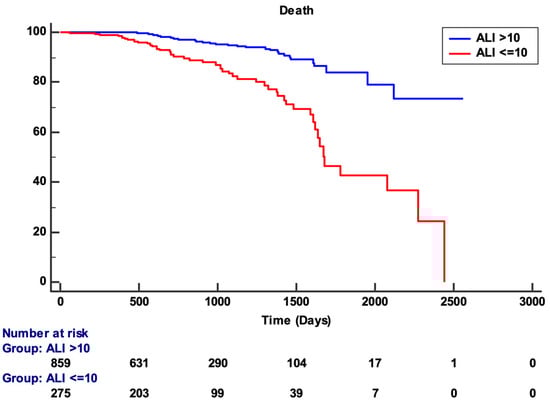 To demonstrate the different survival of patients according to ALI, we clustered the population according to the best-associated criterion of the Youden test (ALI ≤ 10) and showed the different values of free-event survival by using Kaplan–Meier Curves (Figure 3). The graph clearly shows a strong difference in survival between the two populations. The difference in survival is significant, as revealed by the log-rank test (p < 0.001).