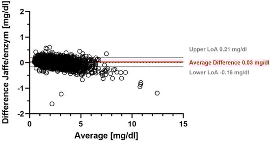 Figure 1 shows a Bland–Altman plot of the difference between serum creatinine determined by the Jaffe method and by the enzymatic method. Solid gray lines represent upper and lower limits of agreement (LoA), and the solid red line represents the average difference, while the dotted gray line marks the zero line.