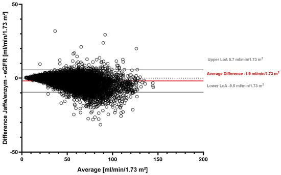 Figure 2 shows a Bland–Altman plot of the difference between eGFR determined with the Jaffe and enzymatic serum creatinine methods. Solid gray lines represent the upper and lower limits of agreement (LoA), the solid red line represents the average difference, and the dotted gray line marks the zero line.
