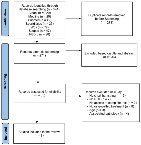A systematic search for randomised controlled trials was conducted in December 2023 across seven databases: PubMed, Medline, Cinahl, Scopus, Web of Science, SPORTDiscus, and PEDro. The search strategy, aimed at addressing the PICOS question, is detailed in the Supplementary Materials, Table S2. For this purpose, the following Medical Subject Headings (MeSH) were combined: Hamstring tendons, Hamstring muscles, Chiropractic manipulation, Orthopedic manipulation, Osteopathic manipulation, Spinal manipulation, Manual therapy, Musculoskeletal manipulation, Osteopathic medicine, and Osteopath. In the PEDro database, an advanced search was performed using the keyword Hamstring and selecting the option Stretching, Mobilisation, Manipulation.