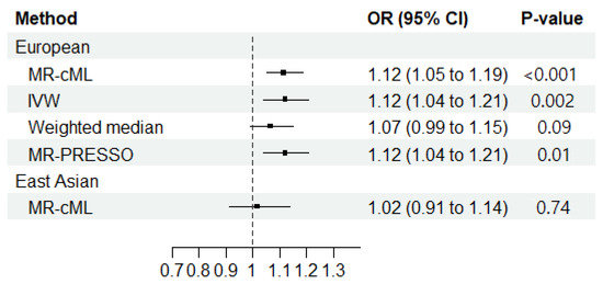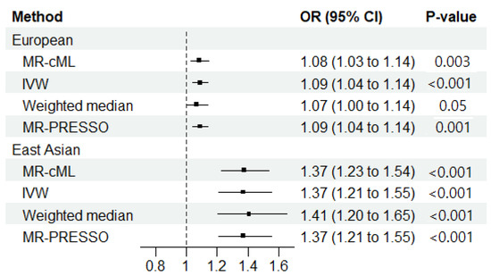 In the primary analysis among the individuals of EAS ancestry, we observed an increased risk of ILD associated with RA (ORMR-cML = 1.37; 95% CI = 1.23–1.54; p < 0.001) (Figure 2). No horizontal pleiotropy (Egger intercept p > 0.05) was observed, but significant heterogeneity was observed with Cochran’s Q test (Cochran’s Q: p < 0.011) (Supplementary Tables S3 and S4). However, in the sensitivity analyses of RA on ILD among those with EAS ancestry, significance was identified by the IVW (ORIVW = 1.37; 95% CI = 1.21–1.56; p < 0.001), the weighted median (ORWeighted median = 1.41; 95% CI = 1.20–1.65; p < 0.001), and the MR-PRESSO methods (ORMR-PRESSO = 1.37; 95% CI = 1.21–1.56; p < 0.001) (Figure 2 and Supplementary Table S5).