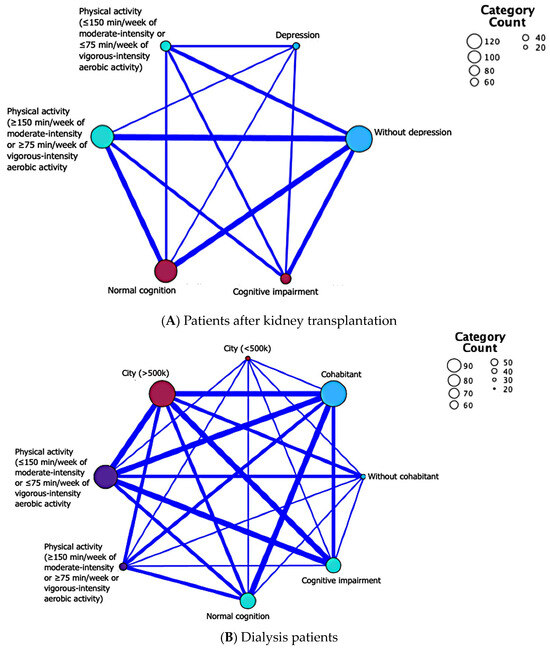Relationship map summarizing the inter-relationships between variables in each subpopulation—(A) kidney transplant recipients and (B) dialysis patients. Only variables statistically significantly different between normal cognition and CI are presented. The thicker the line connecting two variables is, the more the patients manifested both characteristics simultaneously. For instance, in part 1 a, the majority of patients presenting normal cognition had at least 150 min of moderate-intensity or 75 min of vigorous-intensity aerobic activity per week and did not have symptoms of depression in the screening test. Additionally, in part 1 b, most patients with cognitive decline lived in a city with a population of more than 500,000 residents and had less than least 150 min of moderate-intensity or 75 min of vigorous-intensity aerobic activity per week.