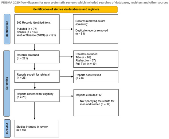 A total of 302 articles were initially identified from all database searches, of which 221 were chosen for screening. The detailed inclusion process is illustrated in the PRISMA flowchart (Figure 1). At the end, 28 full-text articles were analyzed for eligibility in this systematic review. Of these, only 16 met the inclusion criteria and were thus included in the data extraction (Table 1) and quality assessment processes (Table 2).