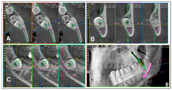 Three-dimensional planning of the surgical access for the IFT in CBCT. The target zone, i.e., the furcation area, is planned in three spatial planes: axial, coronal, and sagittal. (A): axial view, (B): coronal view, (C): sagittal view, (D): 3D representation of the direction and depth of the access to the furcation area.