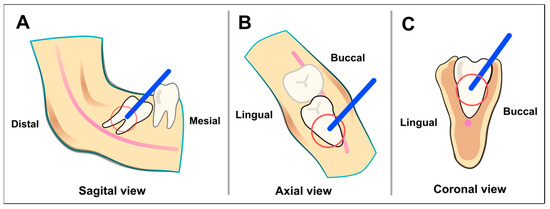 Schematic representation of the access drilling in the three spatial planes. The drill channel is aligned so that a surgical handpiece coming laterally from the cranial side directly reaches the function. The center of the red circle corresponds to the furcation.