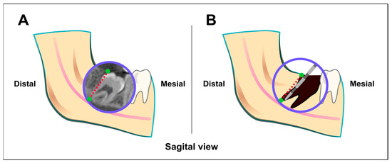 A standard drilling tunnel was planned for access (Figure 2). The tunnel had a length of 11 mm to the hard tissue surface. It was oriented in a buccal–occlusal direction and ended at its deepest point at the furcation of the third molar or at the deepest point of the pulp.