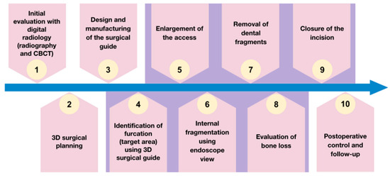 The use of the guiding template for access to the furcation area and subsequent inward fragmentation are summarized in Figure 4. Note that the 3D navigation is used for the location to the critical zone for the internal fragmentation (Figure 4A), while the process of separation and tooth removal (Figure 4B) is performed without 3D guidance under endoscopic microsurgical conditions.