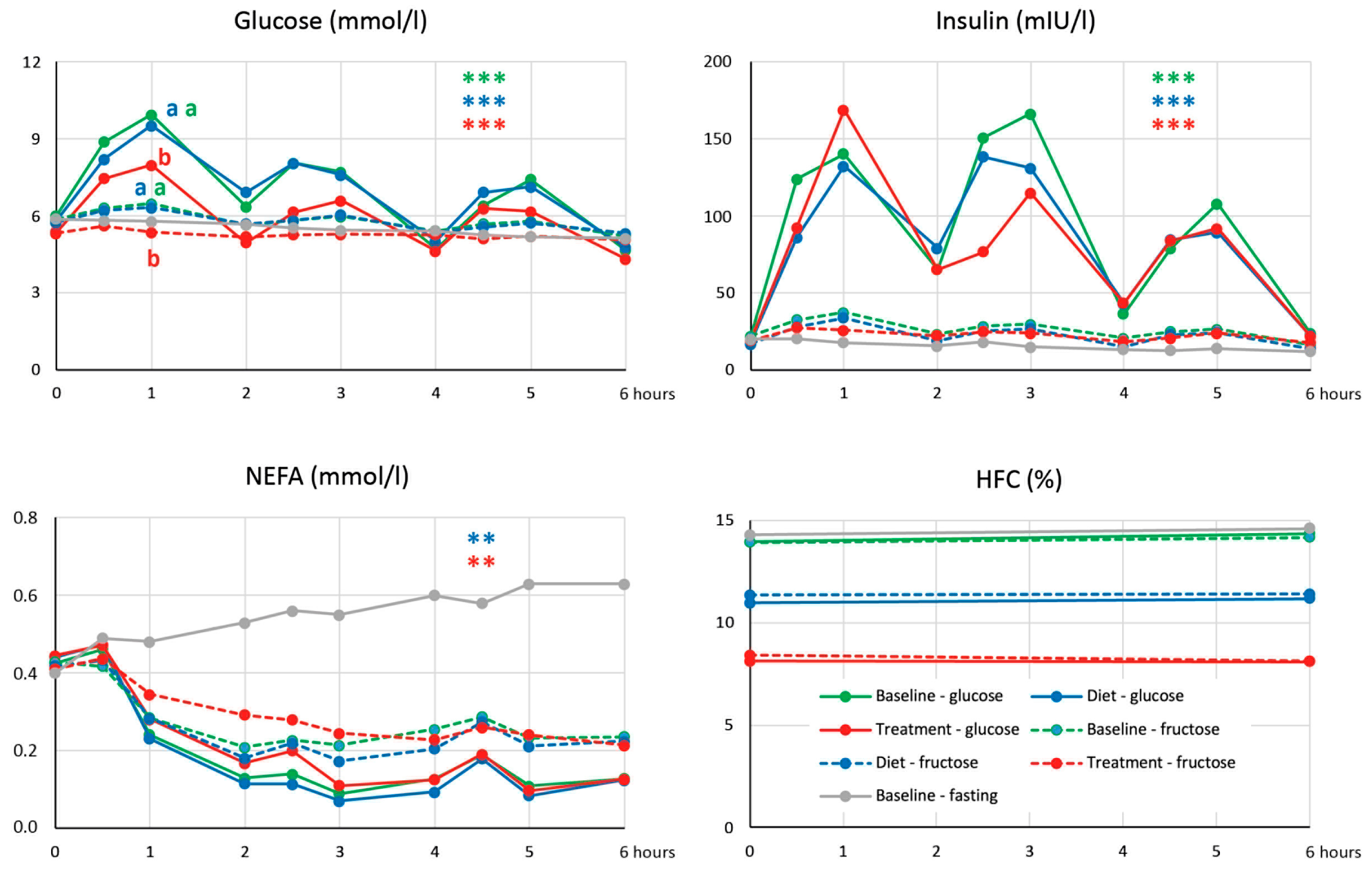- Dusilova, T.; Kovar, J.; Drobny, M.; Sedivy, P.; Dezortova, M.; Poledne, R.; Zemankova, K.; Hajek, M. Different acute effects of fructose and glucose administration on hepatic fat content. Am. J. Clin. Nutr. 2019, 109, 1519–1526. [Google Scholar] [CrossRef]