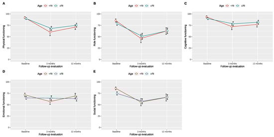QLQ-C30 functioning scores over time based on the proposed age cutoff of 70 years for ileal orthotopic neobladder. (A)–Physical functioning score, (B)–Role functioning score, (C)–Cognitive functioning score, (D)– Emotional functioning score, (E)–Social functioning score.