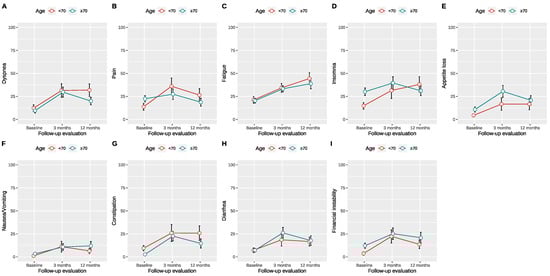 QLQ-C30 symptom scores over time based on the proposed age cutoff of 70 years for ileal orthotopic neobladder. (A)–Dyspnoe score, (B)–Pain score, (C)–Fatique score, (D)–Insomnia score, (E)–Appetite loss score, (F)–Nausea/Vomiting score, (G)–Constipation score, (H)–Diarrhea score, (I)–Financial instability score.