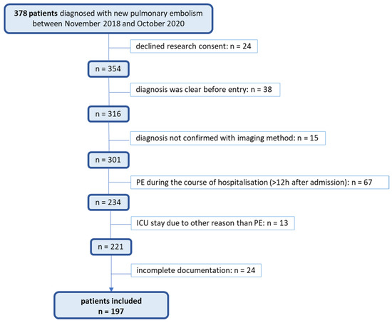 The study population included all patients hospitalized with the International Classification of Diseases (ICD) codes for pulmonary embolism (ICD-10 codes I26.0 for pulmonary embolism with acute cor pulmonale and I26.9 for pulmonary embolism without acute cor pulmonale). Using internal clinical controlling data, 378 hospitalized patients newly diagnosed with PE during this period were identified. All patients included in the analysis were adults. During the study period, 24,556 patients were hospitalized at the medical or surgical ward at the KSBL, with 378 (1.5%) receiving a PE diagnosis during their stay. Each patient’s data were individually reviewed to confirm eligibility based on the study’s inclusion criteria. Adult patients (aged 18 years or older) were included if a new PE was the primary reason for hospitalization and if the diagnosis was confirmed within 12 h of presentation by computed tomography pulmonary angiography (CTPA), scintigraphy, or duplex ultrasound by a specialist. Patients with denied consent or with incomplete/missing diagnostic data were excluded from the study. Ultimately, 197 patients met the study eligibility criteria and were included in the final analysis. The exclusion criteria and the number of patients excluded are detailed in Figure 1.