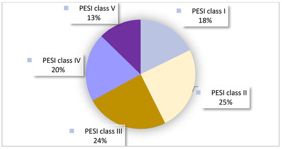 PESI classes used to retrospectively determine the distribution of the Pulmonary Embolism Severity Index (PESI) classes [33]. Class I: less than or equal to 65 PESI points; low 30-day mortality risk from 1% to 6%. Class II: 66–85 PESI points; low mortality risk from 1.7% to 3.5%. Class III: 86–105 PESI points; moderate mortality risk from 3.2% to 7.1%. Class IV: 106–125 PESI points; high mortality risk from 4% to 11.4%. Class V: more than 125 PESI points; high mortality risk from 10% to 24.5%.