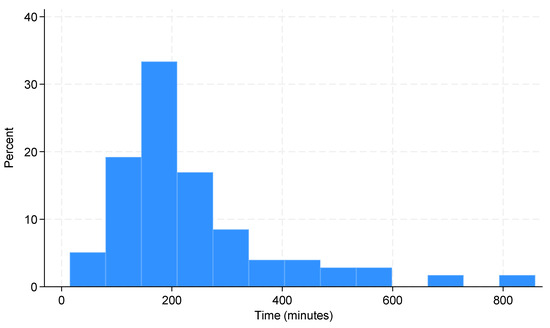 The average time to anticoagulant therapy initiation was 237 min (median 193, IQR 145–277). The distribution of time between admission time and anticoagulation administration is displayed in Figure 3. A loading dose was administered to 16% of patients before CT, and 7% of patients received lysis therapy, primarily via local lysis catheter. Two-thirds of patients received parenteral anticoagulation first, predominantly low-molecular-weight heparin (LMWH), while 39% of patients were started directly on oral anticoagulants, with rivaroxaban being the most commonly prescribed. Anticoagulation duration was generally recommended for 3, 6, or 12 months, or lifelong, though 17% of patients had no specified duration in their discharge reports. During hospitalization, physiotherapy was provided to 58% of patients, while 16% of patients began inhalation therapy. Antibiotics were given to 34% of patients, primarily for urinary tract infections or pneumonia. For more information about treatments, please see Table 5.