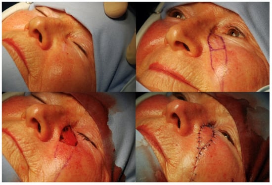 - Cespedes, R.A.D.; Evangelio, L.O.; Oprisan, A.; Perez, A.O. Utility of the Glabellar Flap in the Reconstruction of Medial Canthal Tumors after Mohs Surgery. Turk. J. Ophthalmol. 2021, 51, 118–122. [Google Scholar] [CrossRef] [PubMed] [PubMed Central]