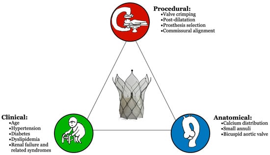 This process has been described as a passive mechanism but also as an active, immune-mediated process []. Further studies have addressed the role of immune responses in prosthesis degeneration. The presence of immune cells, predominantly macrophages, and their products highlight the possible inconsistency of glutaraldehyde treatments in preserving valves from the immune response [,]. From an anatomical perspective, a bulky calcium distribution could play a central role on the functioning of the prosthesis, with a negative impact on heart valve durability []. THVs are placed within an anatomical position marked by calcification and fibrosis, which may exhibit different degrees of asymmetry and distribution. In general, calcium can be present at the level of the annulus, within the cusps, distributed along the commissure, within the left ventricular outflow tract, and in the aortic root-free wall. The distortion of the prosthesis, derived from the inappropriate valve overture due to calcium, could generate flow turbulence and mechanical stress. These improper hemodynamic conditions make valve tissues more susceptible to calcification, resulting in tissue degeneration and prosthesis dysfunction [].