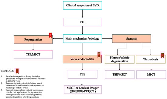 Diagnosis flowchart in case of suspicion of bioprosthesis valve dysfunction. BVD: bioprosthesis valve dysfunction; MSCT: multi-slice computed tomography; TEE: trans-esophageal echocardiography; TTE: trans-thoracic echocardiography; [18F]-FDG-PET: []-fluorodeoxyglucose-positron emission tomography. *: nuclear imaging may be applicable in case of high clinical suspicion of endocarditis with inconclusive TTE/TEE.