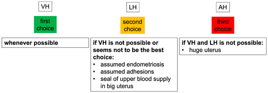 To define a realistic rate of VHs under real-world conditions, a surgeon (Klaus Joachim Neis—KJN), experienced in HEs for all indications (endometriosis, prolapse, and oncology), consistently followed the guidelines in terms of indication and access route for all HEs performed. Only patients with HEs for benign indications were included in this study. Patients with oncological indications, prolapse, or surgery for suspected deep-infiltrating endometriosis, with foreseeable requirements for additional complex procedures, were excluded, as the possible routes of pure hysterectomy without additional procedures were evaluated in this study. VH should be performed whenever possible. If VH is not possible, the second choice should be LH, while AH should only be used if neither VH nor LH are possible. While laparoscopic surgery should not be performed if vaginal access is possible (Figure 1), LH is no longer limited to LAVH. All available types of HE (LAVH, LASH, and TLH) were used.