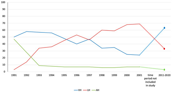 The increasing proportion of LHs led to a steep decrease in AHs from 47% to 9%. From 1994 onwards, in addition to AH being replaced by LH, the rate of VH decreased significantly. There was an unintentional reduction in VHs from 56% (1994) to 24% (2001) within 7 years.