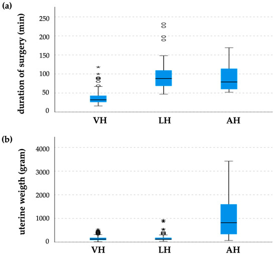 The weights of the extirpated uteri were comparable in the VH (151.8 ± 104.7 g) and LH (183.3 ± 177.0 g) groups (Figure 3b). The maximum weight of the VH group was 540 g and that of the LH group was 930 g. A significant difference (p < 0.001) in the VH and LH groups compared to the AH group (1215.6 ± 1192.1 g) was observed, with a median weight of 820 g and a maximum weight of 3421 g.