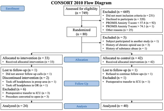 A total of 749 patients were screened from May 2022 to August 2023. We found 493 patients to be eligible; 173 gave informed consent, and 93 patients were considered screen failures because their PROMIS Anxiety T-scores were <57.4 or >74.1. Consequently, 80 patients were randomized. After randomization, five patients were found to be ineligible and removed from the final analysis: one patient participated in another study, one patient had a history of substance abuse, and three patients had a history of chronic opioid use. Out of the 75 remaining patients, 33 were randomized to the music-based intervention group and 42 to the control group. During the follow-up phase in the music-based intervention group, one patient was lost to follow-up, two patients withdrew from the study, and six were excluded due to postoperative transfer to the intensive care unit (ICU) and having their procedure converted from laparoscopic to open. In the control group, one patient was lost to follow-up, and one patient was transferred to the ICU after surgery (Figure 1).
