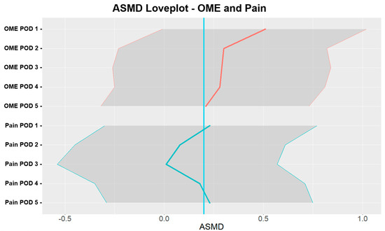 aSMD love plot for OME and pain in the intervention music therapy group vs. the control group. aSMD—absolute standardized mean difference; OME—oral morphine equivalent; POD—postoperative day. The blue line represents a reference for aSMD = 0.2.