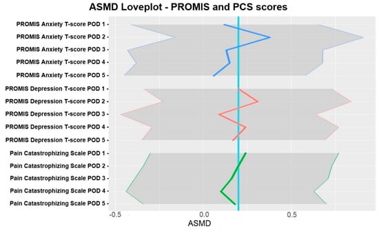 aSMD love plot for PROMIS and PCS scores in the intervention music therapy group vs. the control group. aSMD—absolute standardized mean difference; POD—postoperative day; PCS—Pain Catastrophizing Scale. The blue line represents a reference for aSMD = 0.2.