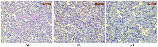 Representative histopathological changes in placenta (H&E). (A) COVID-19-positive pregnant women: small, well-vascularized chorionic villi. Syncytial knots and intervillous fibrin (HE × 10). (B) COVID-19-vaccinated pregnant women: chorionic villi, congestion, and fibrosis (HE × 20). (C) COVID-19-negative and unvaccinated pregnant women: different sizes of chorionic villi, congestion, and area of fibrosis (HE × 10).