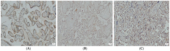Representative images—immunohistochemical visualization of VDR in mononuclear cells of trophoblasts. (A) COVID-19-positive pregnant women (×20). (B) COVID-19-vaccinated pregnant women (×20). (C) COVID-19-negative and unvaccinated pregnant women (×10).