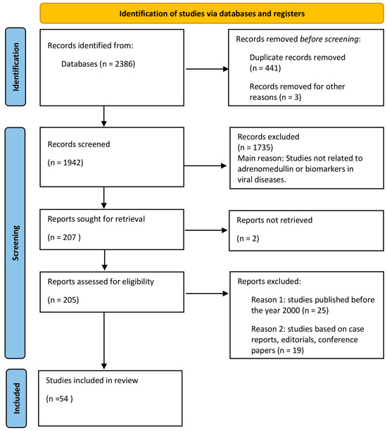 To assess the prognostic value of adrenomedullin and mid-regional proadrenomedullin (MR-proADM) in viral diseases, a comprehensive search was conducted on PubMed and Scopus from 1 November 2023 to 30 May 2024. This search was further supplemented by a Google Scholar query. Specific and effective search strategies were employed for each database utilizing the following terms: ‘MR-proADM’, ‘mid-regional proadrenomedullin’, ‘adrenomedullin’, ‘ADM’, ‘biomarkers’, ‘encephalitis’, ‘brain’, and ‘viral diseases’. The search strategy incorporated both Medical Subject Headings (MeSH) and text words. Additionally, the reference lists of relevant articles were reviewed to identify further pertinent studies. The results were further screened by title and abstract.